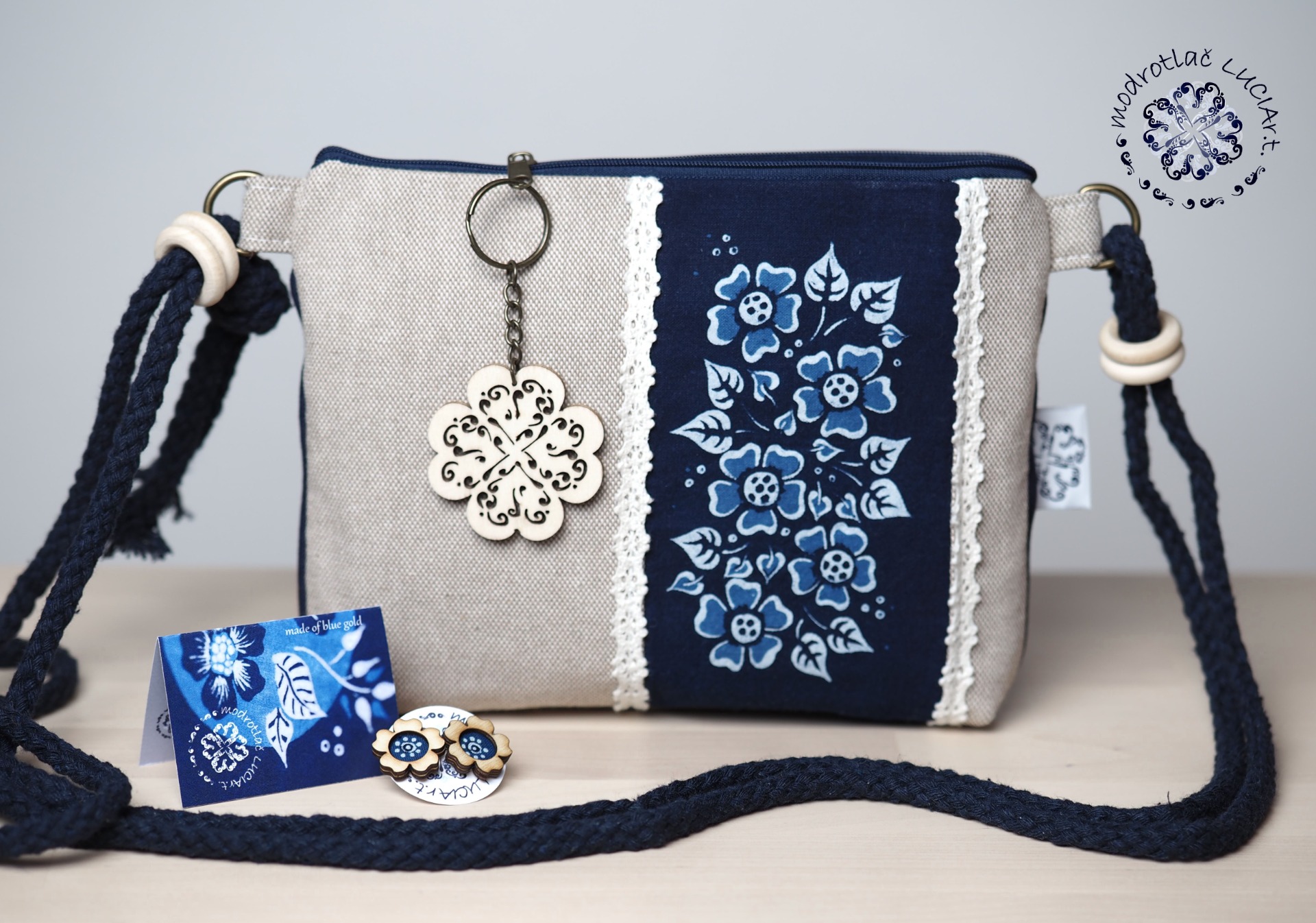 Kabelky šijem z predpraného ľanu alebo bavlneného canvasu. Vnútorný priestor je podšitý bavlnenou látkou a je členený na priehradky. Kabelky sú vystužené hrubým ronofixom. Modrotlač, ktorá je aplikovaná na prednej strane kabeliek farbím technologicky tradične vo vlastnej dielničke ❀ Modrotlač LUCIA r.t. ❀ Vzory nanášam ručne štetcom - maľujem pomocou vlastnej modrotlačiarskej rezervačnej zmesi "pap". Preto je každý vzor jedinečný, nie otlačený rovnakou pečiatkou. Vzor si môžete vybrať z dostupných možností, alebo napísať do správy aký si želáte.