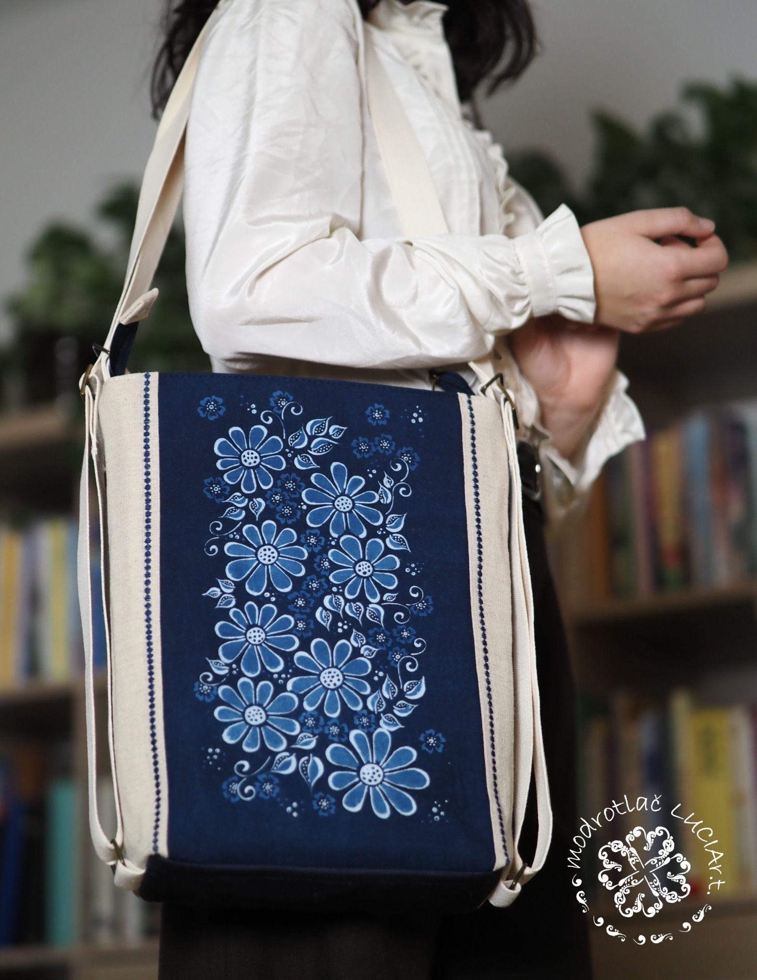Popruh: bavlnený široký 2cm s možnosťou prispôsobiť dĺžku, aby sa dala kabelka pohodlne nosiť aj na pleciach ako batôžtek