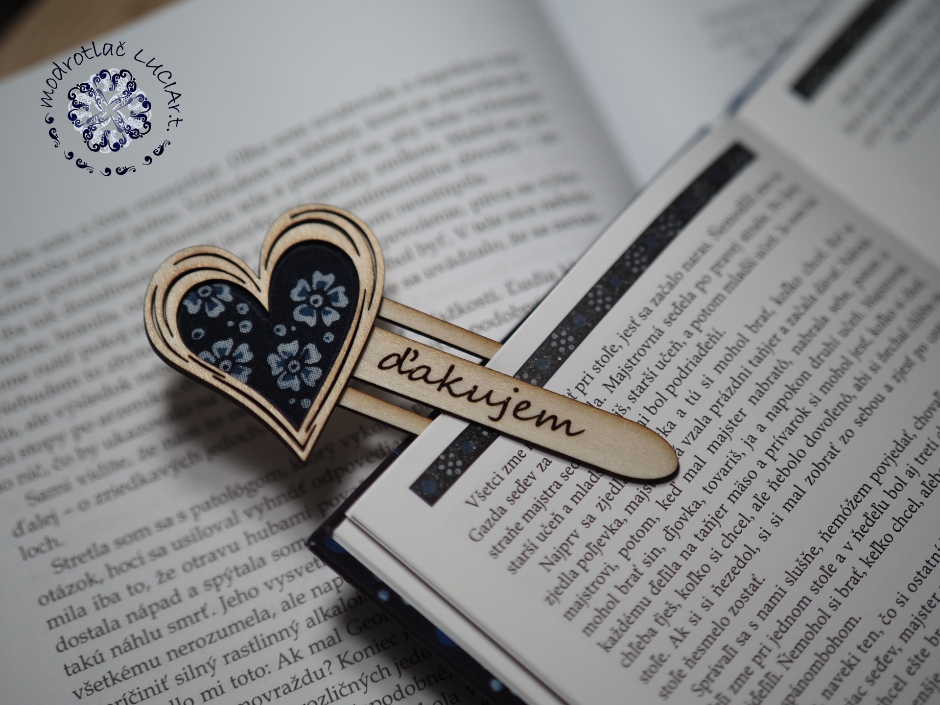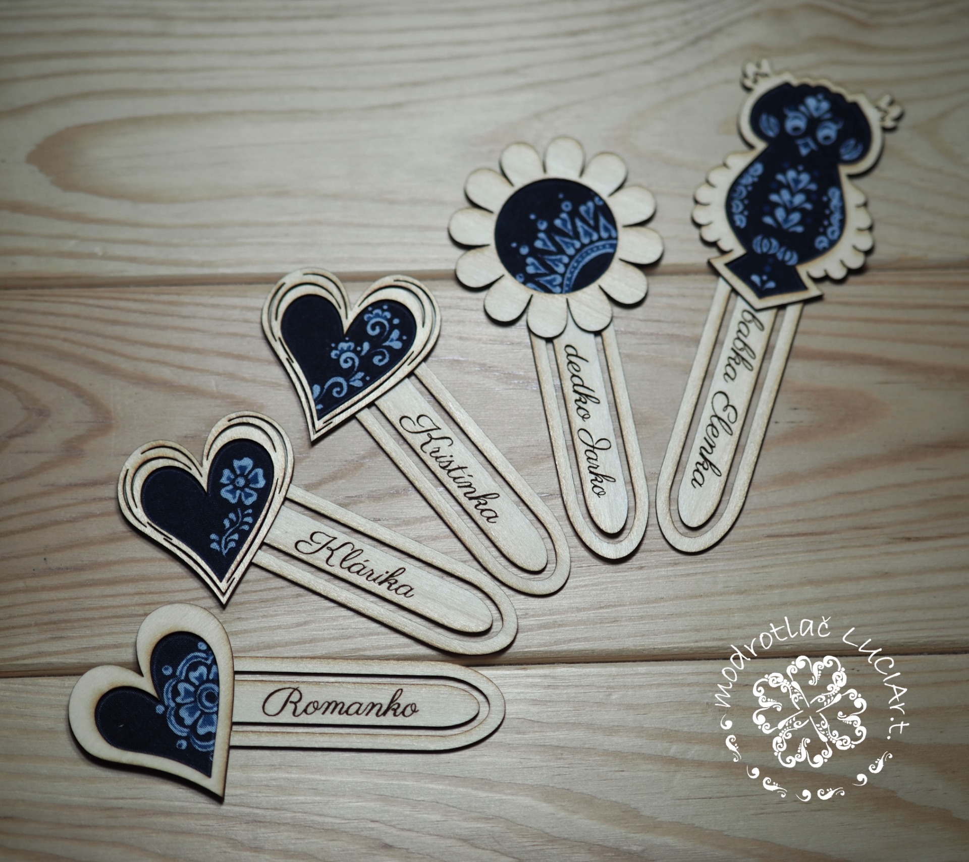 Tvar záložky je vyrezaný z preglejky ako celodrevený štipček.
