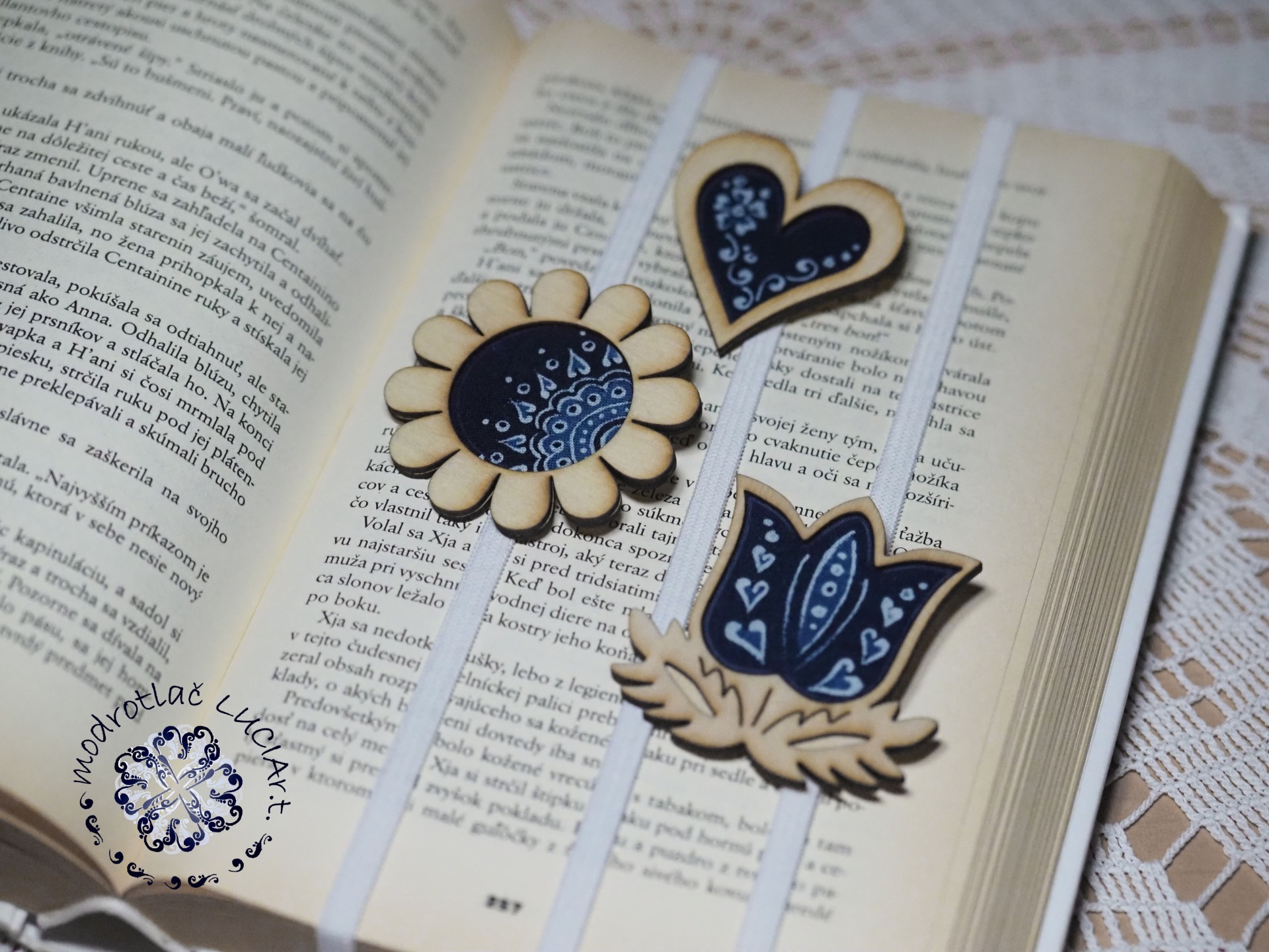 Tvar záložky je vyrezaný z preglejky a založený na gumičke šírky cca 6mm (hrubšia plochá) alebo na guľatej gumičke, ktorá sa ľahko natiahne aj na väčšiu knihu.